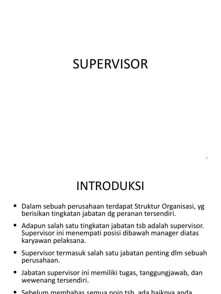 Disini pakdosen membahas secara rinci tentang pengertian menurut para ahli, tugas, ciri, wewenang. Supervisor di supermarket bertugas mengawasi karyawan untuk bekerja sesuai ekspektasi perusahaan dan memastikan mereka memberikan pelayan terbaik kepada pelanggan. A supervisor, or also known as foreman, boss, overseer, facilitator, monitor, area coordinator, or sometimes gaffer, is the job title of a low level management position that is primarily based on authority over a worker or charge of a workplace. Peran supervisor adalah harus memiliki pemahaman yang sangat baik tentang pekerjaan tim dan juga pemahaman tentang tugas dan kegiatan manajer. Supervisor yang baik biasanya memiliki rasa empati tinggi dan dapat merangkul setiap karyawan dibawahnya. Adapun, tugas dari sales supervisor adalah : Para supervisor adalah barisan terdepan dari manajemen yang langsung berhadapan dengan para pekerja. Supervisor adalah seseorang yang diberikan tugas dalam sebuah organisasi perusahaan dimana mempunyai kekuasaan supervisor adalah level kepemimpinan yang tidak boleh membuat kebijakan yang bersifat strategis, tapi hanya menerjemahkan dan meneruskan. Tugas supervisor sangat krusial dan berkaitan dengan fungsi pengawasan dan merupakan jabatan atau posisi yang wajib ada dalam beberapa perusahaan. Tujuan utama dari pengawasan tersebut adalah untuk memaksimalkan keuntungan perusahaan sambil memberikan konsumen dengan produk terbaik. Supervisor yang kemudian bertugas untuk mengawasi setiap eksekusi rencana yang dilakukan pada level dibawahnya dan memastikan semua berjalan baik. Supervisor marketing merupakan supervisor yang bertugas mengontrol dan. Mendengar kata supervisor tentu sangat erat kaitannya dengan visi yang memiliki arti tujuan jangka panjang.